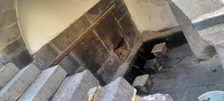 Taş merdivenler kaymış, çökmek üzere, tuvaletler bakımsız pis ve kötü durumda.