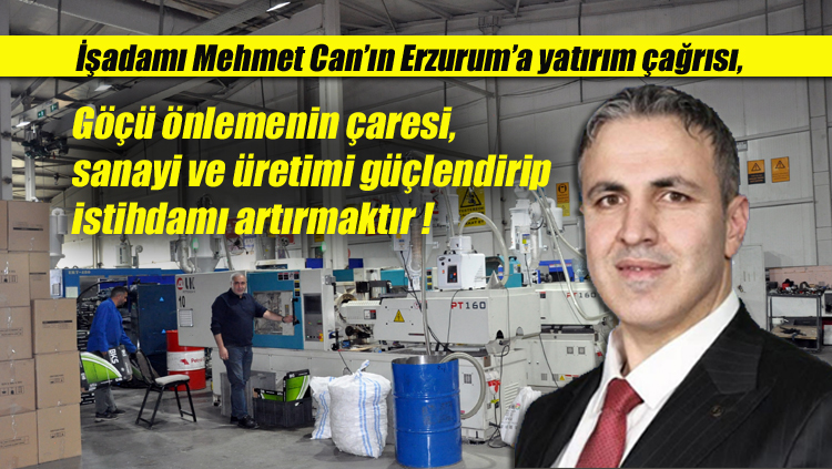 Plastik üretim sektörünün öncü kuruluşlarından Ayne Plastik isimli şirketin üretim tesislerini İstanbul’dan Erzurum’a taşıyarak sanayi yatırımının gelişmesine örnek teşkil eden iş adamı Mehmet Can Erzurum nüfusunun düşüşe geçmesine yönelik yaptığı değerlendirmede, “Bu gidişatı tersine çevirmenin yolu; şehrimizde sanayi ve üretimi artırarak istihdamı güçlendirmektir” diyerek daha fazla sanayi yatırımı yapılması çağrısında bulundu.