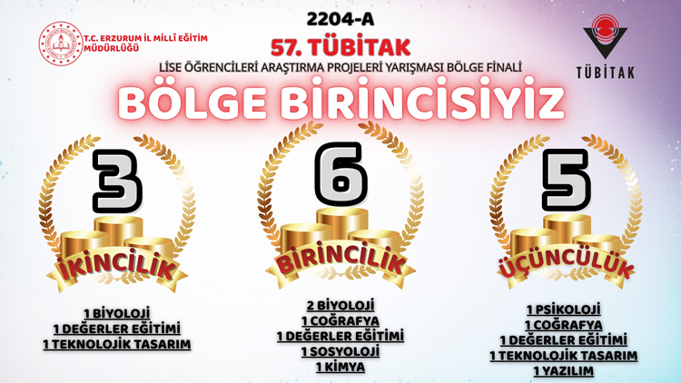 2204-A 57. TÜBİTAK Lise Öğrencileri Araştırma Projeleri Yarışması Bölge Finali bugün Trabzon’da gerçekleştirildi. Erzurum İl Millî Eğitim Müdürlüğü, farklı alanlarda elde ettiği derecelerle bölge finalinde önemli bir başarıya imza atarak bölge birincisi oldu.