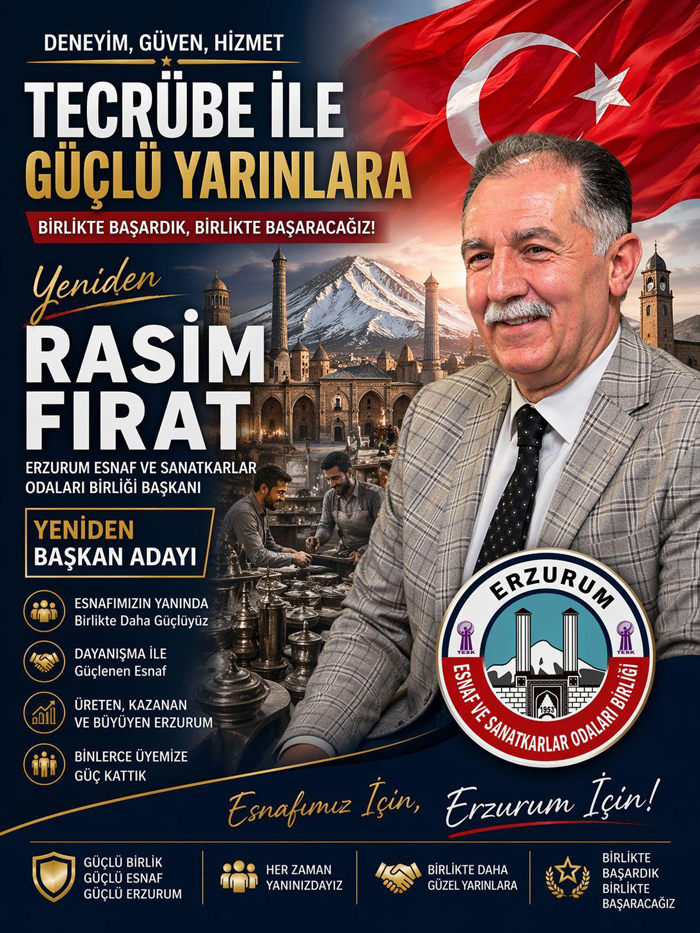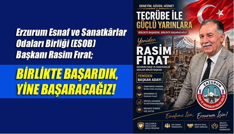 Erzurum Esnaf ve Sanatkârlar Odaları Birliği (ESOB) Başkanı Rasim Fırat, yaklaşan oda başkanlığı seçimleri öncesinde üyelerine yönelik kısa bir mesaj paylaşarak, “BİRLİKTE BAŞARDIK, YİNE BAŞARACAĞIZ!