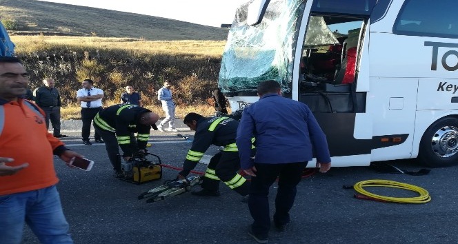 Erzurum-Aşkale karayolunda yolcu otobüsü ile tırın çarpışması sonucu meydana gelen trafik kazasında 4’ü ağır 17 kişi yaralandı.